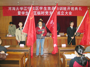 为了加强对学生党员的教育,提高学生党员的素质,进一步增强他们为实现党的路线和纲领而奋斗的信心和决心,自觉践行“三个代表”重要思想;为了推进党团组织进学生社区,使党组织的工作深入到党员和学生“家”中,将党的声音、党的影响、党的知识以及党的组织工作覆盖面扩展到宿舍,校组织部、党校、学生工作部决定对学生党员进行教育培训,并在学生社区开展成立临时党支部的试点。4月4日在校本部报告厅举行了江宁校区学生党员培训班开班典礼暨学生社区临时党支部成立仪式大会。校党委副书记郑大俊、陈德奎出席会议。出席会议的还有组织部、学工部负责人,各学院党委、总支副书记,以及江宁校区全体学生党员和学生六舍党员,大会由党校副校长、组织部副部长高德华主持。会上,组织部蒋来娣部长宣读了关于学生社区临时党支部成立的决定,党委副书记郑大俊、陈德奎、组织部部长蒋来娣为学生社区临时党支部授旗,陈德奎同志做重要讲话,他从当前在高校加强学生党建工作的重要意义谈起,并对学生党员在加强自身修养、不断完善自我、积极为党工作、发挥先锋模范作用等方面提出了要求,他希望学生社区临时党支部成立后,在学生教育、管理、生活的各个方面有党的声音,发挥党员先锋模范作用。他还要求学生党员珍惜这次学习培训机会,端正态度,认真学习,努力提高自己的思想政治觉悟和党性修养,强化党员先进性意识,不断完善自我,成为党的事业的可靠接班人。