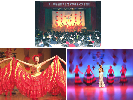开幕式文艺演出表演精彩纷呈,台下喝彩声此起彼伏,歌声掌声融成一片欢乐的海洋。文艺演出的节目有相声、小品、大型民族舞蹈、劲舞、独唱、男女声组合演唱及民乐联奏等。其中,教工民乐队的民乐联奏和梁敏老师的独唱《幸福山歌》博得满场喝彩。最后,晚会取得圆满成功,正式拉开了第十四届校园文化艺术节的序幕。