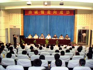 环境学院王镝同学代表03级全体同学宣读了“诚信倡议书”。与会同学在庄严的国歌声中举起右手,郑重宣誓:严守考试纪律,以实际行动维护考试的公正与公平;用诚信检验知识与能力,用诚信构筑健全人格,用诚信呵护大学生的荣誉;不负国家、社会与家庭重托,由诚信走向成功。