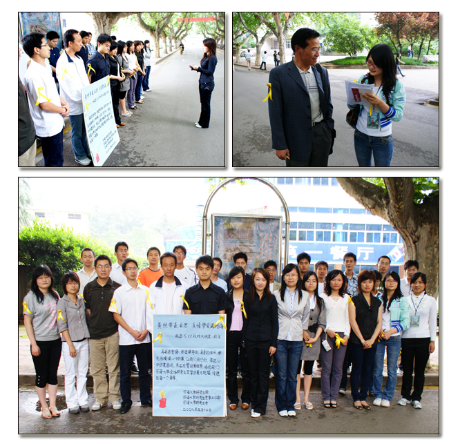 为表达对四川汶川大地震遇难同胞的深切哀悼,5月12日下午,河海大学研究生院、研究生工作部、校研究生会在第一学生食堂前举行“黄色丝带寄哀思,真情挚爱满河海”纪念汶川地震一周年活动,用真情悼念死难者,用真心为汶川人民祈福。研究生代表吴轲威致辞,寄托河海研究生对汶川大地震的深切哀思以及对汶川人民的真挚的爱与祝福。全体研究生会成员在右臂佩戴上代表哀思的黄色丝带,集体肃立默哀一分钟,表达对受灾人民的深切怀念。随后,研究生会各部门组成小分队在学校的各条主干道上向路过的师生放送黄丝带并向他们介绍此次活动的意义,激发大家的爱国心、同情心和奋进心。