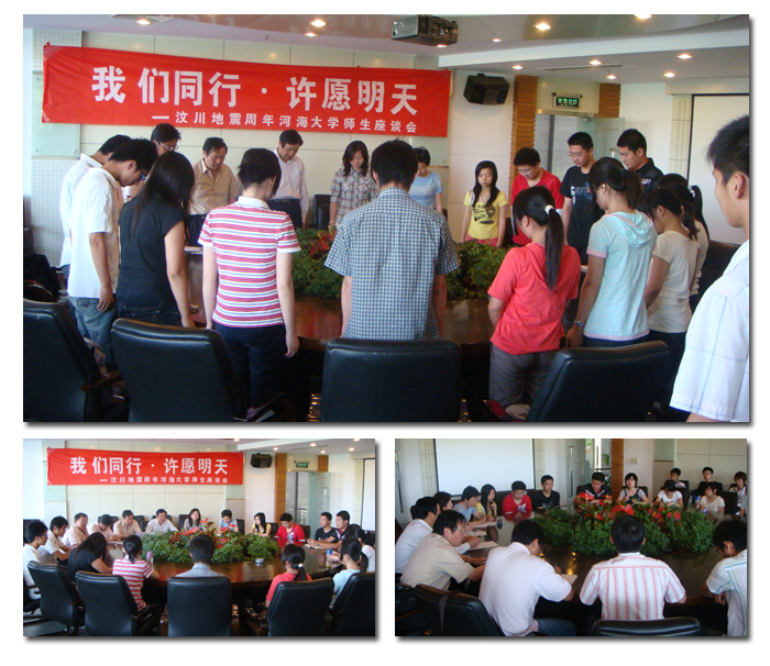2009年5月8日下午,河海大学在江宁校区会议中心召开了主题为“我们同行•许愿明天”――汶川地震周年师生座谈会。校党委郑大俊副书记,组织部、宣传部、学生处、团委等部门负责人,地震灾区学生代表,校学生会以及校心理健康协会负责同学也参加了此次座谈会。会议由学生处副处长蒲晓东主持。首先全体参会人员起立为地震罹难同胞默哀。然后来自地震灾区的同学各自汇报了自己近一年来的学习、生活情况,大家纷纷谈到自己在地震发生时和发生后的心理感受,对党和政府给予的大力支持、全国人民向地震灾区提供的无私援助和精神支持表示真诚的感谢。学校在地震发生后及时了解学生家庭受灾情况、免除学费、发放慰问金、生活补助金和返乡补助,学生处等部门在中秋和元旦组织开展其乐融融的活动,以及校心理健康协会等学生组织开展相应的心理抚慰活动,让他们充分感受到了学校大家庭的温暖,极大的鼓舞了他们战胜困难的勇气。他们纷纷表示,请学校放心,他们的学习非常努力,生活也非常温馨,家乡的人们精神饱满,生产生活秩序和恢复重建工作也取得了很大进展,他们将继续刻苦学习,不断提升自身综合素质,不断提升就业竞争力和可持续发展能力,为祖国社会主义事业的发展作出应有的贡献。