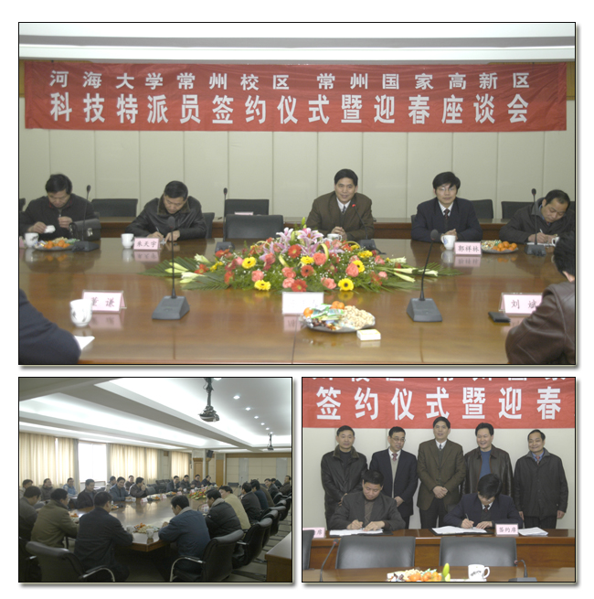 为落实我校常州校区―常州国家高新区全面合作协议,把校区和常州国家高新区推向深入,拓宽校区为地方服务的范围和广度,校区选派楼力律、刘景两位青年教师分别担任常州国家高新区西夏墅镇、孟河镇两镇的科技特派员,协助所在镇的科技工作。1月30日,首批科技特派员派出签约仪式在校区隆重举行。常州国家高新区党工委常委、组织部长陈正春、管委会副主任董谦,校区管委会主任周建方等领导和双方有关部门负责人参加了签约仪式和迎新春茶话会活动。周建方主任从校区服务地方这一定位的角度,对两位特派员提出了要求。一是要认清使命,有所作为;二是要虚心学习,主动接受区科技局和所在镇政府领导安排的工作;三是要大胆开拓,充分依托学校专业优势,切实做好学校和地方的桥梁作用。