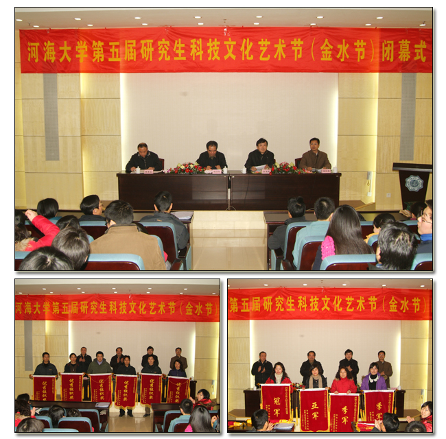 我校第五届研究生科技文化艺术节(金水节)胜利闭幕,党委书记林萍华教授出席闭幕式并宣布第五届金水节闭幕。闭幕式由研究生院副院长钱向东主持, 党委研究生工作部部长兼研究生院副院长张海军部长代表金水节组织委员会做了第五届金水节总结报告,研究生院副院长陈青生宣读了本届金水节的表彰名单,与会领导向获奖单位和个人颁发了锦旗和证书,闭幕式在欢快喜悦的气氛中落下帷幕。闭幕式上林书记充分肯定了第五届金水节在校园文化建设中发挥的巨大作用,勉励研究生要自觉地把问题放在文化层面进行再认识。