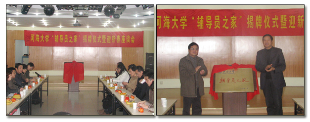 1月11日,窗外冬雨绵绵、寒气袭人,室内却充满“家”的温馨,河海大学举行了“辅导员之家”揭牌仪式暨迎新春座谈会。校长张长宽教授为“辅导员之家”题名,校党委副书记郑大俊教授出席仪式并与江宁校区管委会主任任旭华教授一起为“辅导员之家”揭牌。校有关部门与青和物业负责人、各学院分管书记以及全体本科生辅导员参加了此次活动。活动由学生处副处长蒲晓东主持。“辅导员之家”位于江南骏园,定位为辅导员“学习交流的平台,健身休闲的场所,放飞心灵的港湾”。“辅导员之家”分为三个功能区:一是读书学习区,订有数十种报刊及有关国际时政、党建和大学生生活、思想、心理教育方面的书籍;二是运动健身区,设有十多种健身设施及乒乓球、羽毛球等运动器材;三是休闲娱乐区,有小型舞台、KTV唱歌系统,可举行聚会和棋牌活动等。