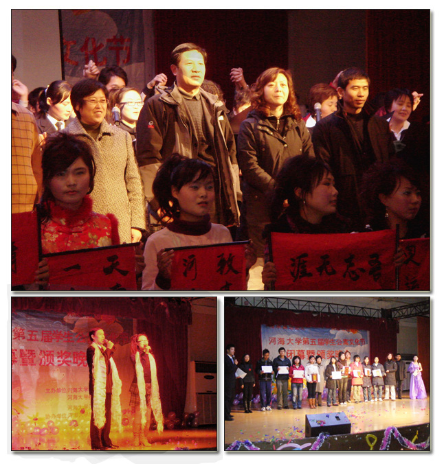 12月17日,第五届学生公寓文化节闭幕式暨颁奖晚会在多功能厅举行。校党委郑大俊副书记,江宁校区管委会、学生处、团委等部门的领导、各院副书记及江宁辅导员受邀出席了闭幕式。激情昂扬的二胡合奏、大饱耳福的歌曲串烧,引起大家阵阵欢呼。由自管会成员为大家奉献的一场时装秀,不仅有着视觉的新意更有着创造的新意,个性、帅气、阳光的服装是节俭校园行的活动成果,成为晚会的一大亮点。奥运五环的呈现,寝室卧谈节目体现了“传承奥运圣火,共建和谐社区”的主题。对联接龙更是精彩十足,自管会各部门的代表及主席团用对联的形式为2008年北京的奥运盛会送上了最真诚的祝福,也给我们的学校、我们的社区送上了最美好的祝愿。