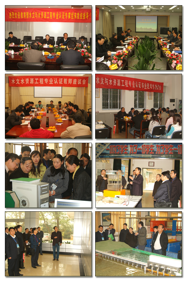 以西安理工大学沈冰教授为组长的教育部专家组听取和审阅了学校的自评报告,考察了实验室、图书馆等教学设施,分别召开了教师、学生及用人单位座谈会,进行了随堂听课并对学生进行了笔试和问卷调查。专家组一致认为,河海大学水文与水资源工程专业拥有办学历史悠久、专业建设倍受学校重视、有国家重点学科和国家重点实验室以及国家工程研究中心为依托、师资力量雄厚等优势,具有根据国家需求适时修订人才培养方案、课程建设和教育教学改革卓有成效、学生的学术和实践活动丰富、毕业生深受社会欢迎等特色,总体达到认证标准要求。专家组还就一些具体问题提出了改进的意见与建议。