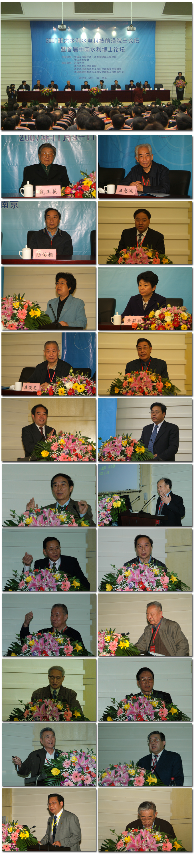 2007重大水利水电科技前沿院士论坛暨首届中国水利博士论坛于11月10日至11日在河海大学举行。全国政协原副主席、中国工程院院士钱正英出席开幕式。江苏省委书记、省长梁保华会见前来出席论坛的20位院士和水利部领导。省委副书记张连珍、水利部副部长胡四一出席并致辞,水利部原部长汪恕诚,长江三峡工程开发总公司原总经理、中国工程院院士陆佑楣,江苏省人民政府副省长黄莉新出席开幕式。