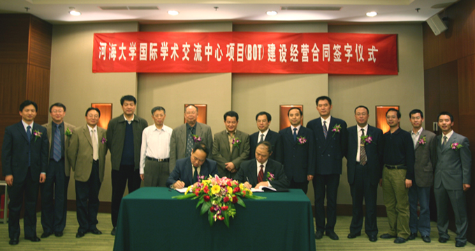“河海大学国际学术交流中心”项目是我校“十一五”建设重点项目,得到了黄河万家寨水利枢纽有限公司的大力支持。本着互惠互利、合作双赢的宗旨,我校与黄河万家寨水利枢纽有限公司经过认真讨论、多次研究和充分论证,就该项目BOT建设经营形式及内容达成了一致意见。根据国家(BOT)建设有关之规定,由黄河万家寨水利枢纽有限公司投资兴建“河海大学国际学术交流中心”项目主体设施及相关附属设施。建成后并经营,经营期届满后,将该项目的经营管理权移交我校。