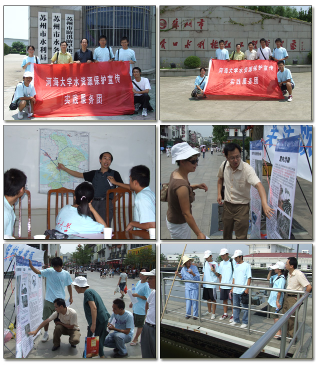 针对前不久无锡市因蓝藻暴发而引发的饮用水危机,同学们在苏州闹市区观前街进行了环保宣传,现场悬挂写有“关注饮用水、保护水资源”横幅,精心制作的环保知识展板、富有特色的环保知识传单,迎来了过往的苏州市民和众多游客的积极关注与参与,令同学们特别高兴的是不少报考河海大学的应届高中毕业生也闻讯而来,加入到宣传环保知识的队伍中。另外,此次在观前街的环保宣传活动,扬子晚报王建康记者全程跟踪报道。7月20日的扬子晚报、人民网、中国新闻图片网、盛世观前网等新闻媒体均对此作了报道。