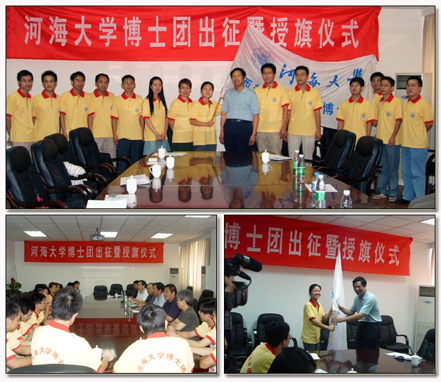 会上,郑大俊副书记代表学校向博士团授旗,并勉励同学们要在社会实践中发扬吃苦精神,虚心刻苦学习,做到学以致用,展示河海风采,确保安全顺利。博士团团长、校研究生科协主席刘湘琴代表博士团接过旗帜,并代表所有成员发言表示一定要发扬吃苦耐劳的精神,树一流形象,创一流成果。