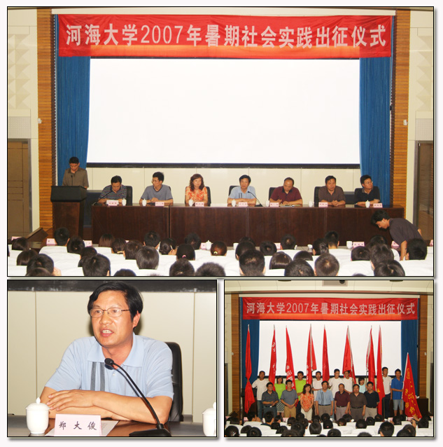 河海大学今年暑期社会实践活动以贯彻落实胡锦涛总书记重要讲话精神,把广大青年学生培养成为“理想远大、信念坚定的新一代,品德高尚、意志顽强的新一代,视野开阔、知识丰富的新一代,开拓进取、艰苦创业的新一代”为指导思想,以“实践促成才,青春创和谐,建设新江苏,喜迎十七大”为活动主题,学校及各学院组织学生开展主题突出、内容丰富、形式多样的活动,主要有:和谐社会建设宣传服务、奥运精神宣讲、形势政策宣讲、“红色之旅”参观学习、西部水电博士生实践服务、促进江苏“两个率先”博士生科技服务、建设社会主义新农村实践服务、未成年人思想道德建设实践服务、社会热点调查、大学生志愿者社区服务、“爱国爱水爱校”主题实践活动、暑期科技创新创业活动等,共组建了2个博士生科技服务团、70个校级本科生实践服务团、120个院级实践服务团队。