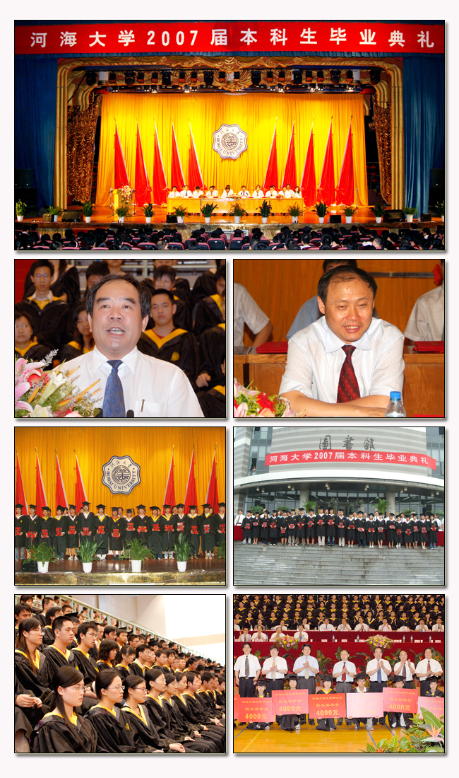 张校长首先向毕业生同学们作了题为“社会大课堂,实践好导师”的重要讲话。他代表学校向为大家的成长、进步倾注无数心血的老师们表示最衷心的感谢;向一直关注河海发展、支持和帮助同学们顺利完成学业的家长和亲友们表示最亲切的问候。他指出,经济社会的飞速发展和变化,既给我们创造了千载难逢的机遇,又给我们提出了前所未有的挑战。要在种种挑战中应付裕如,我们除了要有明确的学习目标和勤奋刻苦的毅力以外,还要有独立思考、勇于创新的精神。社会环境是复杂多变的,我们所从事的各项工作也不可能是一帆风顺的,我们只有不断在实践中独立思考、勇于创新,才能打破旧的传统,应对新的挑战;才能发现真理,超越前人,超越自己,取得杰出的成就。最后,张校长对即将毕业启程的同学们送上衷心的祝福和希望,希望同学们在社会的大课堂里,以实践为师,转益多师,不断地增长才干,提高自己的综合素质,努力成为胡锦涛总书记在今年“五四”期间所提出的四个“新一代”,在服务社会主义和谐社会和创新型国家建设的伟大实践中建功立业、施展才华,为母校增光添彩!