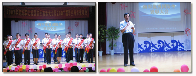 6月24日,由我校学生处、海军选培办、国防生党总支共同举办的“2007年度海军优秀国防生表彰大会暨欢送2007届毕业国防生晚会”在江宁校区多功能厅隆重举行。校党委副书记郑大俊教授到会,并为获奖国防生颁奖。学校有关职能部门及相关学院的领导一同观看了国防生文艺演出。郑书记在表彰大会中对即将毕业的首届海军国防生表示祝贺,他指出:“07届毕业国防生政治信念坚定,专业学习刻苦,军政素质优良,彰显了国防生的魅力。”郑书记还为毕业国防生提出了几点希望:“希望我们的毕业国防生在今后的人生道路上,立志做大事,做真人,学为争先,行为争范,做上善若水的人,做笃学敦行的人,在部队的大熔炉中尽快锻炼成长为政治素质过硬、业务素质扎实、军事素质精良,适应现代化国防事业和军队建设的国防精英,以优异的成绩回报母校。”