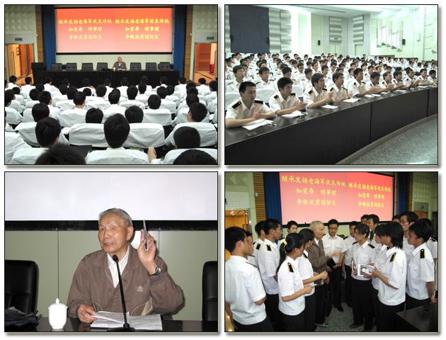 为贯彻落实胡锦涛主席牢固树立社会主义荣辱观的重要讲话精神,2006年5月19日,河海大学海军国防生在江宁校区开展了“继承发扬老海军优良传统 知荣辱 明事理 争做优秀国防生”主题教育活动。中国人民解放军驻河海大学后备军官选拔培训工作办公室邀请了全军十佳老干部,参加过平津、淮海战役的海军指挥学院退休干部朱民老人为全体国防生做报告。朱老的报告热情洋溢,生动翔实,多次被国防生的掌声打断,大家仿佛依稀看到了老一辈海军的优良作风。他的报告深深打动了每一名在场的国防生,大家都为他的爱党爱国、艰苦朴素、坚强刚毅的品质所感染。