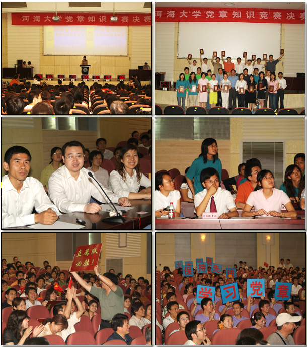5月31日下午,校党委组织的党章知识竞赛决赛在新研究生楼108举行。校党委林萍华书记、郑大俊副书记、陈德奎副书记应邀出席了此次党章知识竞赛。此次党章知识竞赛是我校学习党章系列活动之一,是为了纪念建党85周年,贯彻落实胡锦涛同志提出的“学习党章、遵守党章、贯彻党章、维护党章”的要求而开展的。此次活动由师生共同参与,改变了以往党章学习的传统方式,在轻松、热烈的竞赛抢答过程中潜移默化的接受了一次深入的党章教育,并对党的知识作了一次全面的了解,促进了我校学习党章活动的深入开展。