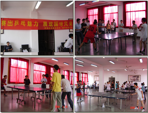 室外骄阳似火,室内热火朝天。由河海大学研究生会主办,理学院研究生分会承办的河海大学研究生乒乓球赛于5月27日和28日在教工之家(校工会四楼)顺利举行,来自全校各院和联合培养单位的研究生乒乓球好手集聚一堂,切磋球艺,一比高下。本次比赛共设男子单打、女子单打和男子双打三个比赛项目,采取十一分赛制,分小组单循环比赛,小组胜出者再进行两轮淘汰赛,淘汰赛的胜者进入决赛。最终,来自南科院谢振安同学技高一筹,力压群雄。摘得男子单打比赛的冠军,亚军被土木院的毛哲军获得,机电院的徐迈里和环境院的何金平获得季军。女子单打比赛冠亚军分别由土木学院的李丹丹和梁桂兰获得,理学院的王雅静和公管院的陈少妹获得季军。土木学院的毛哲军和杨晓星获得了男子双打比赛的冠军,理学院的马万强和徐迈里获得亚军,电气院的杨威和林其友获得了第三名。