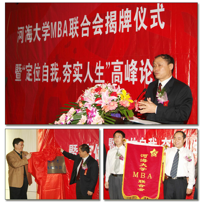 2006年5月6日下午,河海大学MBA联合会成立揭牌仪式及“定位自我,夯实人生”高峰论坛在河海大学新研究生楼隆重举行。河海大学校长张长宽教授出席了此次大会。南京大学、东南大学、南京理工大学等兄弟院校联合会主席及代表到会,对河海大学MBA联合会的成立表示祝贺。河海大学MBA联合会是河海大学MBA学员、MBA校友的群众性组织,由河海大学研究生院、河海大学商学院联合指导。张长宽校长宣布河海大学MBA联合会成立,并与商学院院长张阳共同揭开“河海大学MBA联合会”铜牌的面纱,为河海大学MBA揭开了崭新的一页。党委研工部潘正初部长、商学院党委杨士魁书记为河海大学MBA联合会授旗。兄弟院校、论坛特邀嘉宾也一一表达了对河海大学MBA联合会成立的祝贺。张校长从我校商学院的渊源谈起,希望河海MBA继续向着“培养具有全球战略意识的企业家、培养能够适应全球化竞争的职业经理”这一目标稳步迈进。
