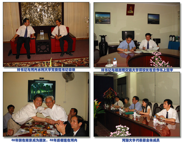 由校党委书记林萍华教授率领的河海大学代表团日前访问了越南。在越南期间,代表团先后与胡志明交通大学、南方水利科学研究院、河内土木大学、河内水利大学进行了交流,并与胡志明交通大学签订了“2+1+2”合作培养学生协议书,即由胡志明交通大学在本校选拔读完本科二年级课程的优秀学生,到河海大学先补习一年汉语,再学习两年专业课,成绩合格者由河海大学发给本科毕业证书和学士学位;与河内土木大学交换了同样内容的备忘录,正式协议将于近期签订。河海大学还与三校一院就进一步拓展合作领域、联合开展科学研究及共同申报项目等方面达成了意向。河海大学在上世纪50至60年代就培养了不少越南学生,他们已成为本国各领域的元老及骨干,此次参加接待的人员中就有多名当年的河海学子。目前,胡志明交通大学、南方水利科学研究院、河内水利大学分别有多名教师及科研人员在河海大学攻读博士学位。