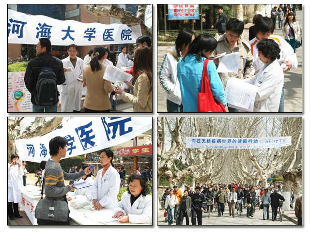 春季,随着气温的升高,各种传染疾病的病发率呈上升趋势。结核病,这一世界性的顽症,尤其容易在校园这类人群密集处传播。为配合“世界防结日”的宣传,3月24日上午11点半左右,校医院多位医生在本部学生城楼下摆开桌椅和展板,宣传预防结核病的相关知识,同时向学生们分发宣传单和小礼品。来往学生纷纷驻足阅读展板上的内容,很多人还提出了咨询。