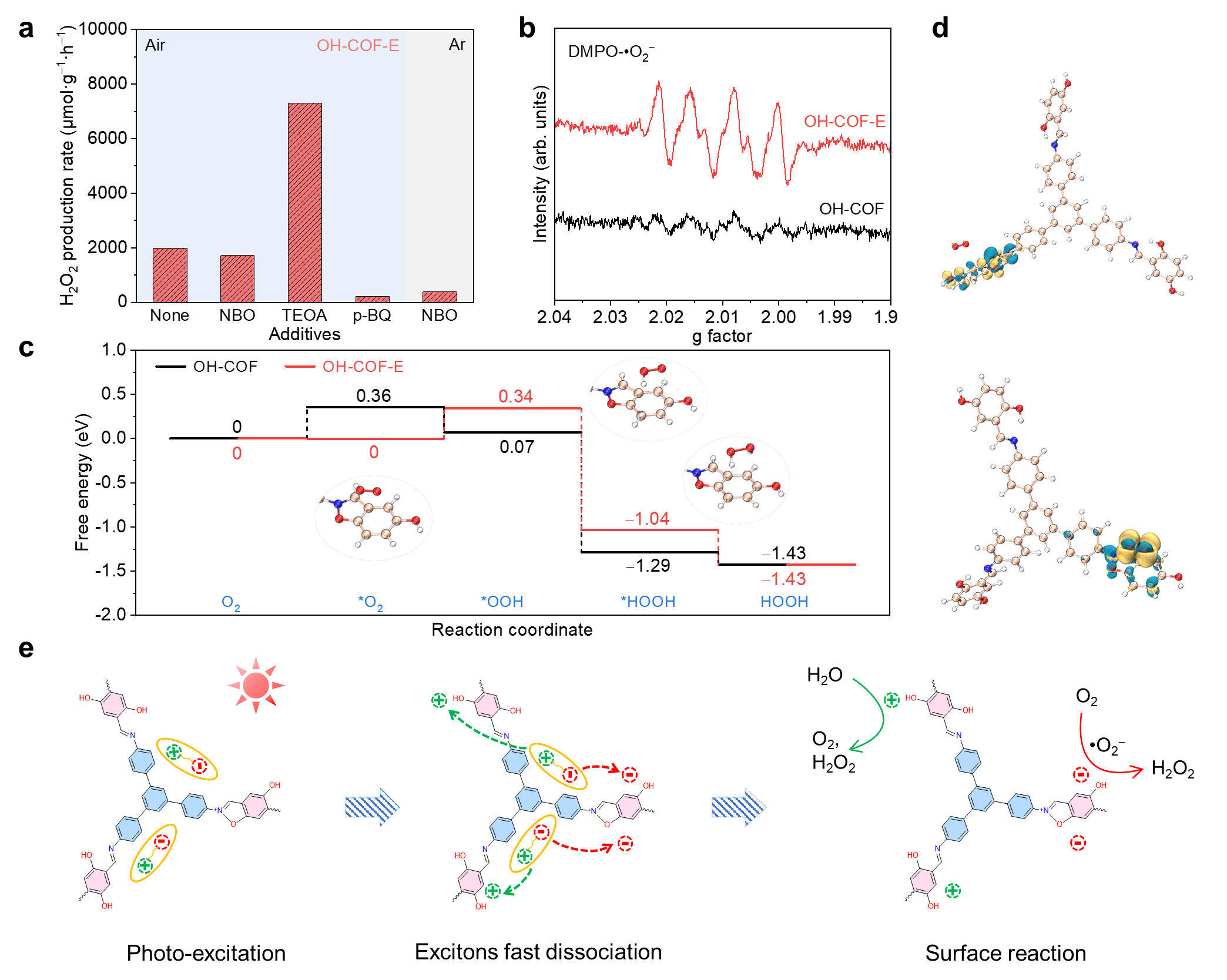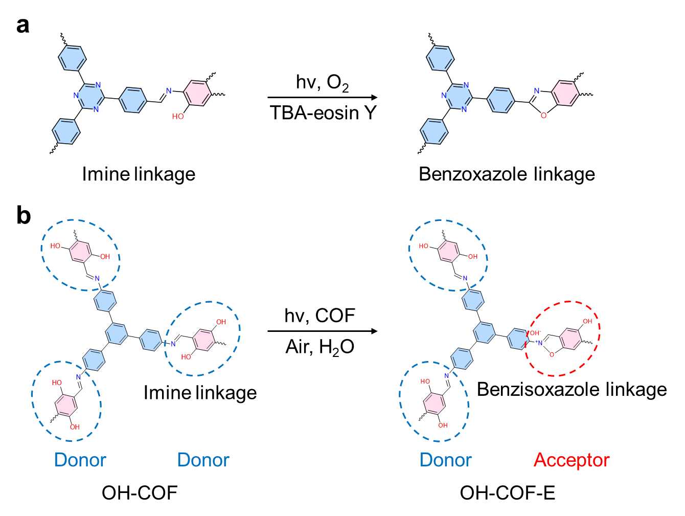 本研究结合光催化氧还原反应,将亚胺(Imine)连接的OH-COF原位部分转化为苯并异恶唑(Benzisoxazole)连接的OH-COF-E,从而构建具有给体-受体(D-A)结构的共价有机框架(图1)。这种方法巧妙地将光催化过程与传统合成化学结合,开创了一种在反应体系中动态构建和优化催化剂结构的新途径。