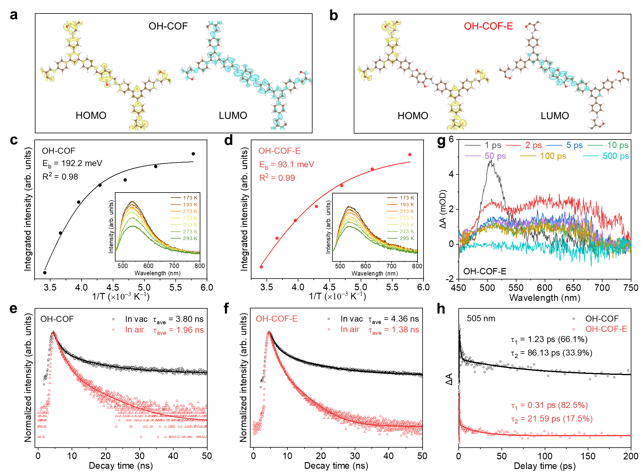 实验结果表明,这种部分转化为苯并异恶唑连接的共价有机框架在纯水中实现了1986.9μmolg-1h-1的过氧化氢高产率(图2)。理论计算与光谱表征证实,由于供体-受体结构的形成,载流子分离与传输效率显著提升(图3)。此外,原位生成的苯并异恶唑单元同时充当电子受体和催化中心,促进双氧水还原为超氧自由基(·O2-),进而转化为过氧化氢,最终提高产率(图2)。本研究不仅提出了一种原位合成苯并异恶唑连接共价有机框架的新合成路线,而且验证了原位构建供体受体结构以提高光催化生成过氧化氢性能的开创性方法。