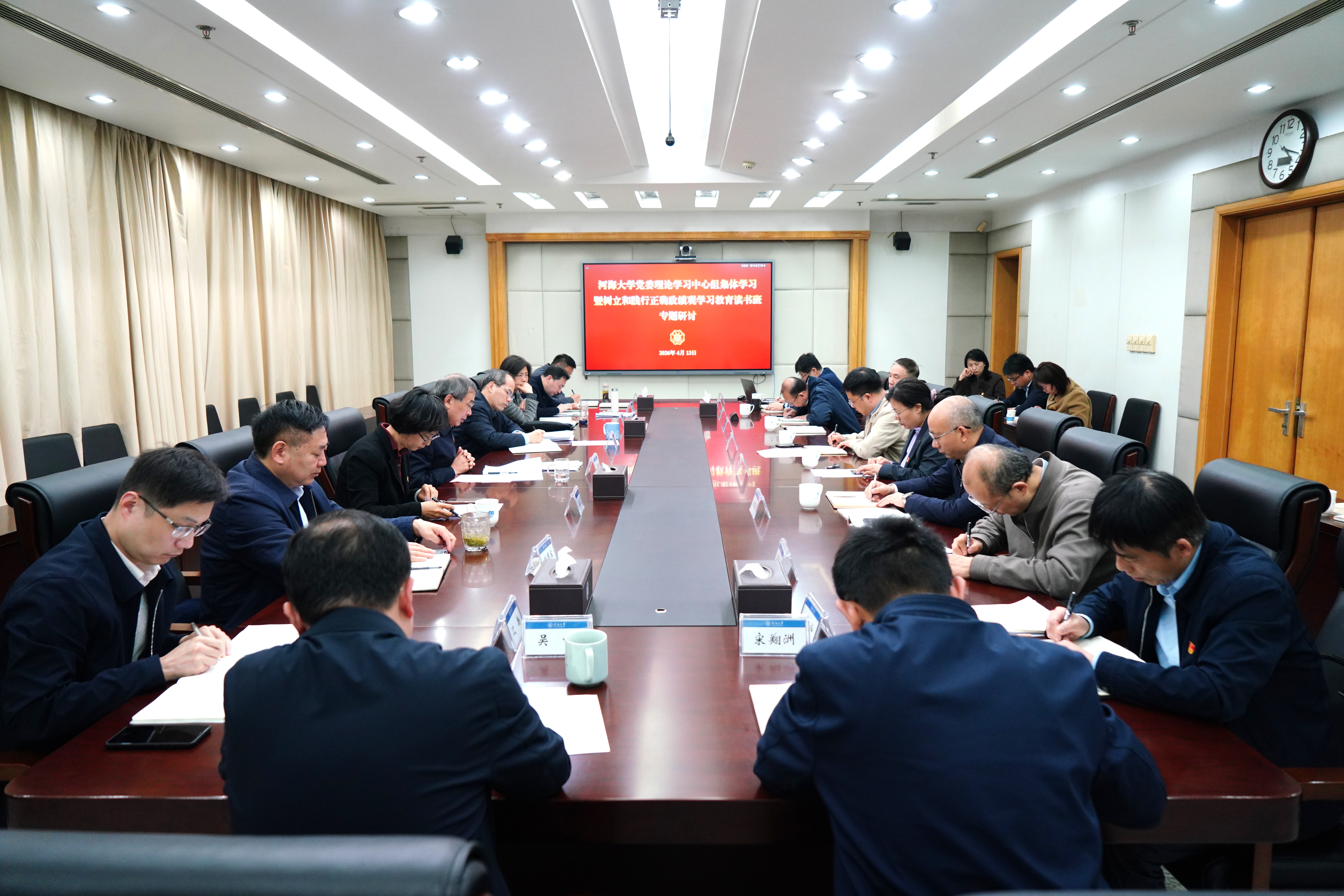 4月13日,河海大学举行校党委中心组集体学习暨树立和践行正确政绩观学习教育读书班第二次专题研讨。校党委书记杨桂山主持学习,江苏省委教育工委高校巡学旁听第五组组长、省教育厅二级巡视员崔春霞一行列席指导。全体校领导做了交流发言。