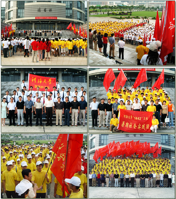 7月8日,河海大学举行暑期社会实践活动出发仪式,学校领导和有关部门负责人将一面面队旗授予即将踏上社会实践征途的团队。河海大学今年暑期社会实践的主题是:“践行荣辱观,服务新农村,投身‘两个率先’,构筑和谐社会”,共组织了有2000余名学生参加的50个校级团队和100个院级团队,前往苏北以及中部、西部、东北地区,开展社会主义荣辱观与建设和谐社会宣传、建设社会主义新农村等形势政策演讲、法律知识普及、社会热点调查、实用技术培训、环境保护教育、节水社会创建以及支农支教、企业帮扶、科研攻关、社区援助等活动;其他学生按照“就近就便”的原则,自行选择社会实践活动的内容与形式。