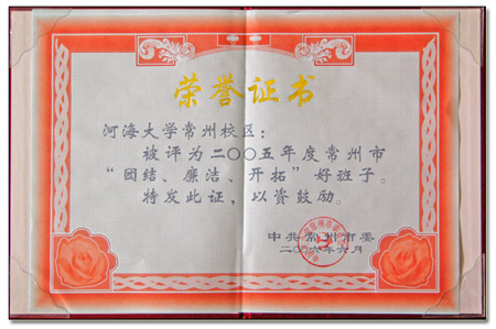 日前,河海大学常州校区被中共常州市委评为2005年度“团结、廉洁、开拓”“好班子”荣誉称号,并于6月29日在常州市委召开的纪念建中国共产党成立85周年大会上受到嘉奖。2005年,常州校区坚持以邓小平理论和“三个代表”重要思想为指导,认真贯彻落实常州市委《关于进一步深入开展创建“团结、廉洁、开拓”好班子活动的意见》的要求,紧紧围绕市委“两个率先”和学校第十一次党代会确定的战略目标,积极创新发展思路,扎扎实实开展“团结、廉洁、开拓”“好班子”创建工作,在理论学习、精神状态、团结协作、勤政廉洁、工作实绩等方面都取得了可喜的成绩,受到各方面的好评。