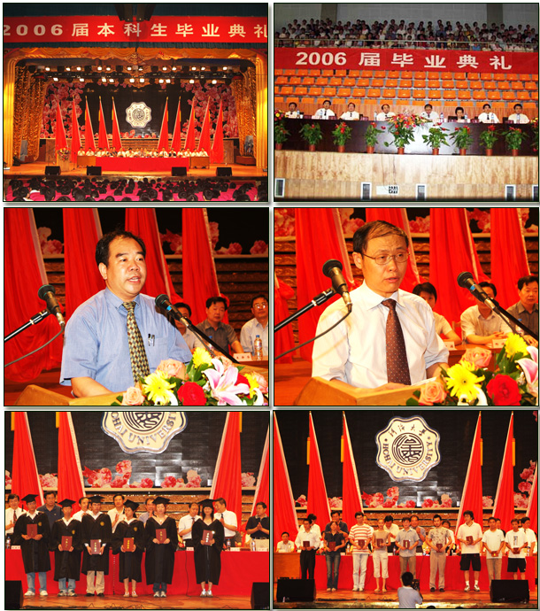 6月27日,我校在校本部和常州校区分别举行2006届本科生毕业典礼,欢送本科生毕业离开母校。校党委书记林萍华教授、校长张长宽教授出席了毕业典礼。校党委副书记郑大俊教授主持大会。典礼在全场热烈的掌声中拉开序幕。校长张长宽教授作了题为《献身 负责 求实》的毕业献词。张校长首先与同学们一起分享了他们成长和成熟的喜悦,并对他们所取得的成绩表示了最热烈的祝贺,同时还代表学校对那些春风化雨辛勤育人的教师们表达了真心的感谢。他指出,温家宝总理在我校90周年校庆时提出的“献身、负责、求实”这6字中国水利精神,实际上就是我们河海大学应当遵循的办学理念,实际上就是我们河海全体师生追求成功人生,实现自我价值所应当凭藉的宝贵精神财富。因此,在这毕业道别的特殊时刻,他仅从学长和师友的角度希望河海全体师生特别是即将毕业的06届学子们,在今后的人生道路上,务必要像总理所深切希望的那样,大力发扬献身的精神、负责的精神和求实的精神。最后张校长讲到:“河海校友历来具有关心、支持母校建设的优良传统,这也是推动学校发展的重要力量。希望同学们离开学校之后,无论走到哪里,都继续关心和支持母校的发展。母校会永远支持、关心、关注同学们,为同学们所取得的每一项成绩而自豪;同时,母校更盼望同学们今后常回母校,亲眼看看母校的发展变化。”