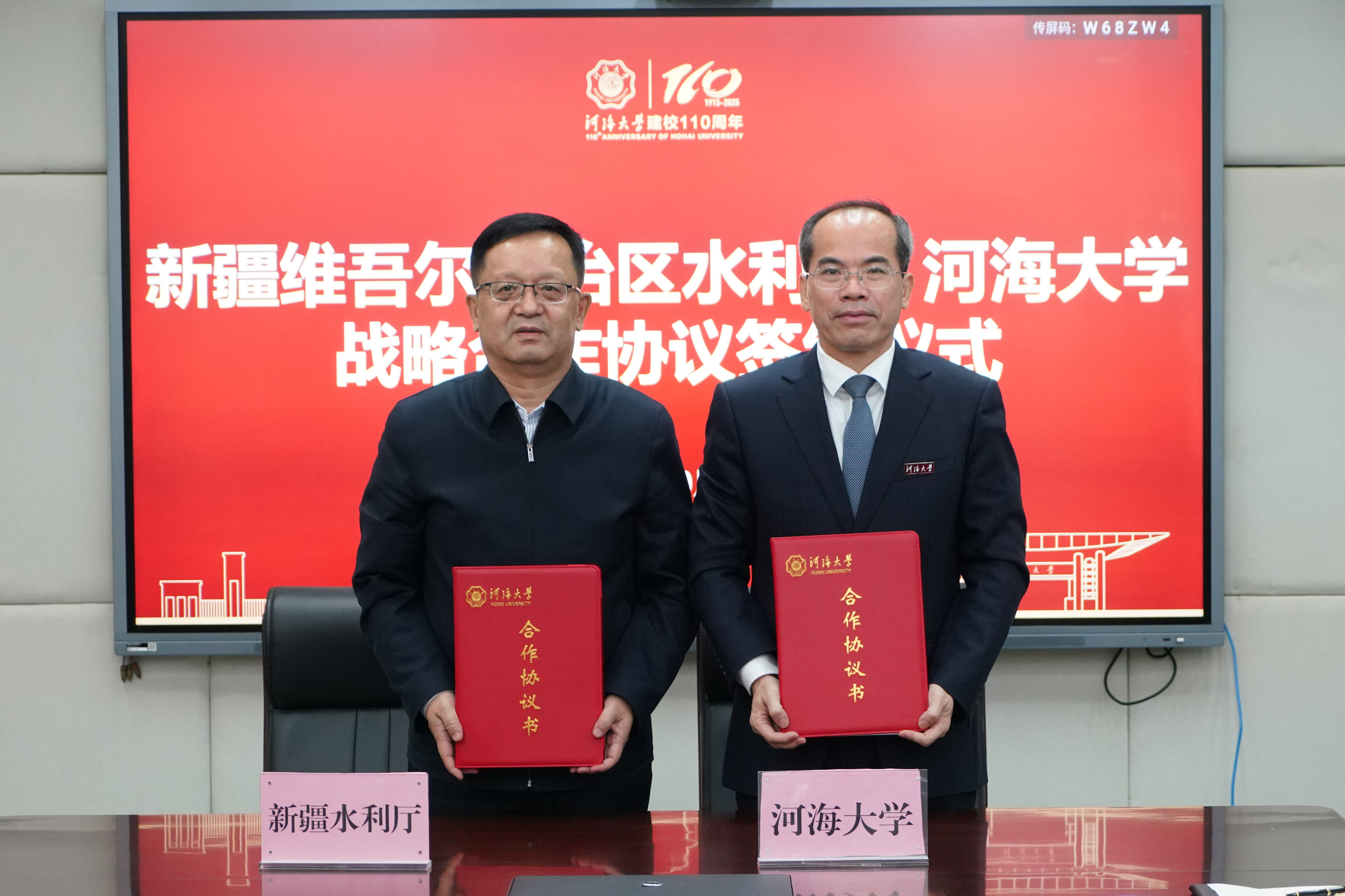 会上,梅钰、郑金海代表双方签署《新疆维吾尔自治区水利厅河海大学战略合作框架协议》。